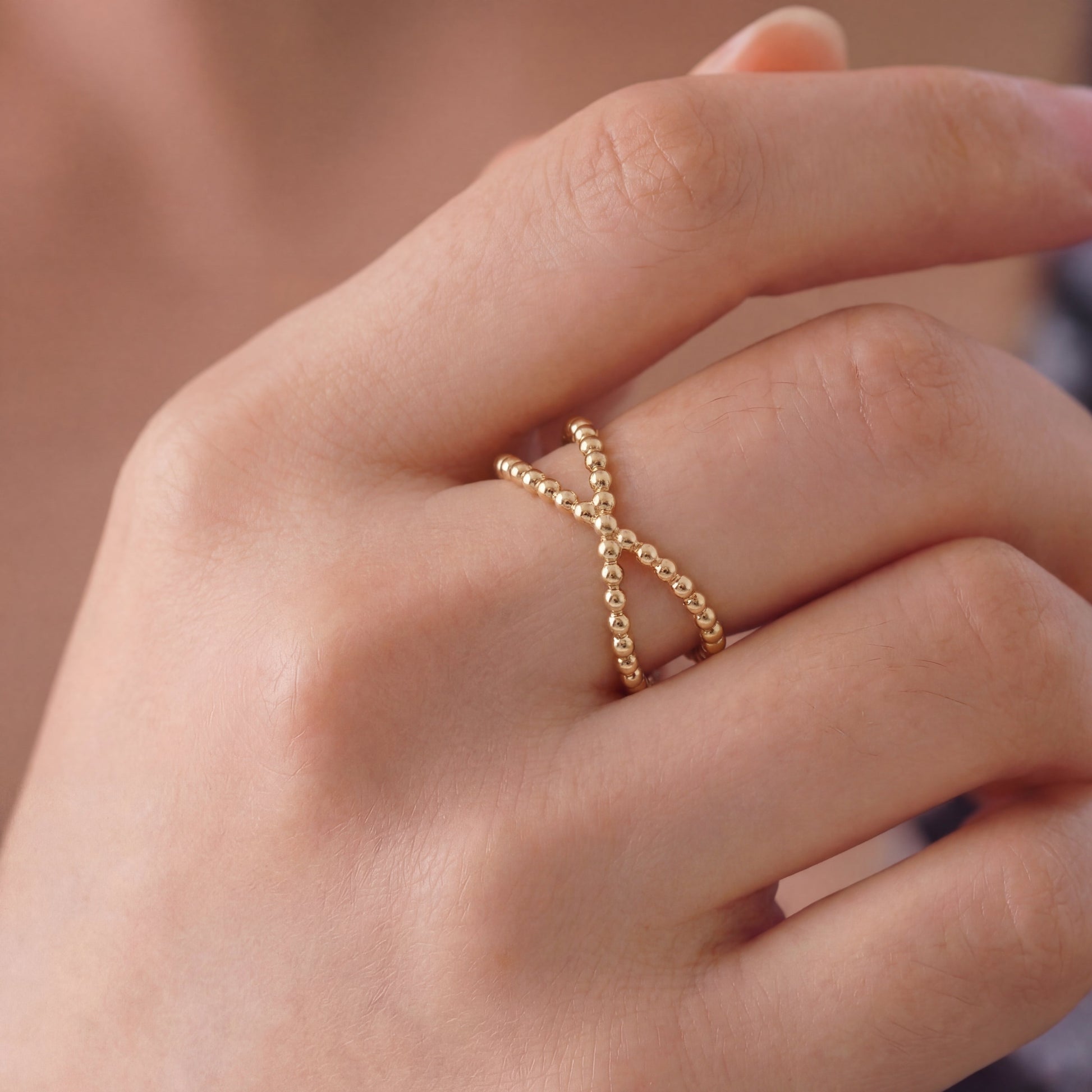 A contemporary gold ring crafted with two graceful bands that intersect to form an open cross silhouette. Each band is adorned with fine gold bead detailing, creating a soft texture that enhances the brilliance of the polished metal. The airy structure and delicate craftsmanship give the ring a modern yet timeless appeal, making it a distinctive statement of minimalist luxury.