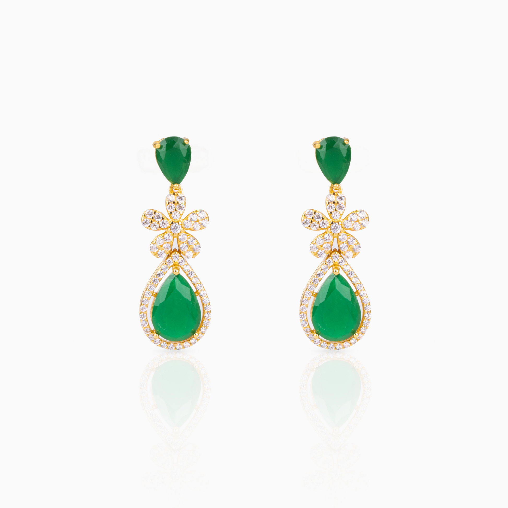 These earrings feature a tiered silhouette that mirrors the collection’s floral motif. Each piece begins with a delicate emerald teardrop stud that supports a shimmering crystalline flower. The design culminates in a matching high-lustre emerald-green drop, encased in a brilliant-cut crystal halo, adding depth, brilliance, and refined movement.
