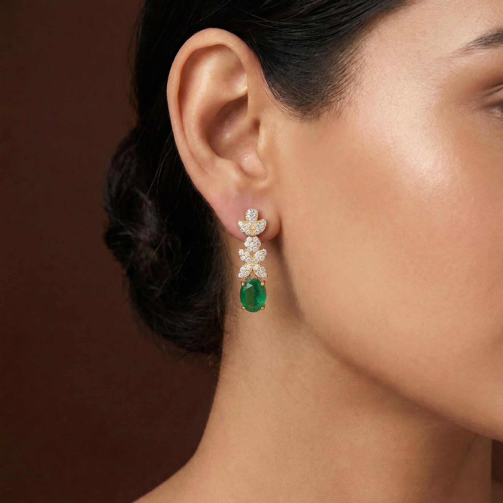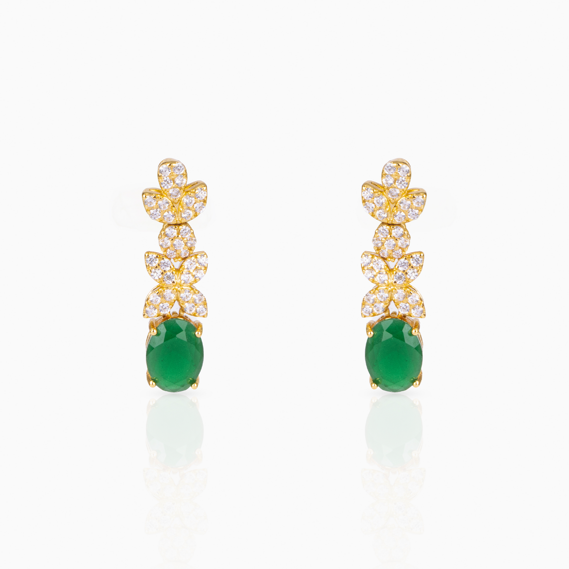 These earrings feature a delicate vertical arrangement of brilliant-cut crystals that lead into a richly hued emerald-green oval centerpiece. Each emerald stone is encased within a fine crystalline halo, enhancing its depth and radiance.