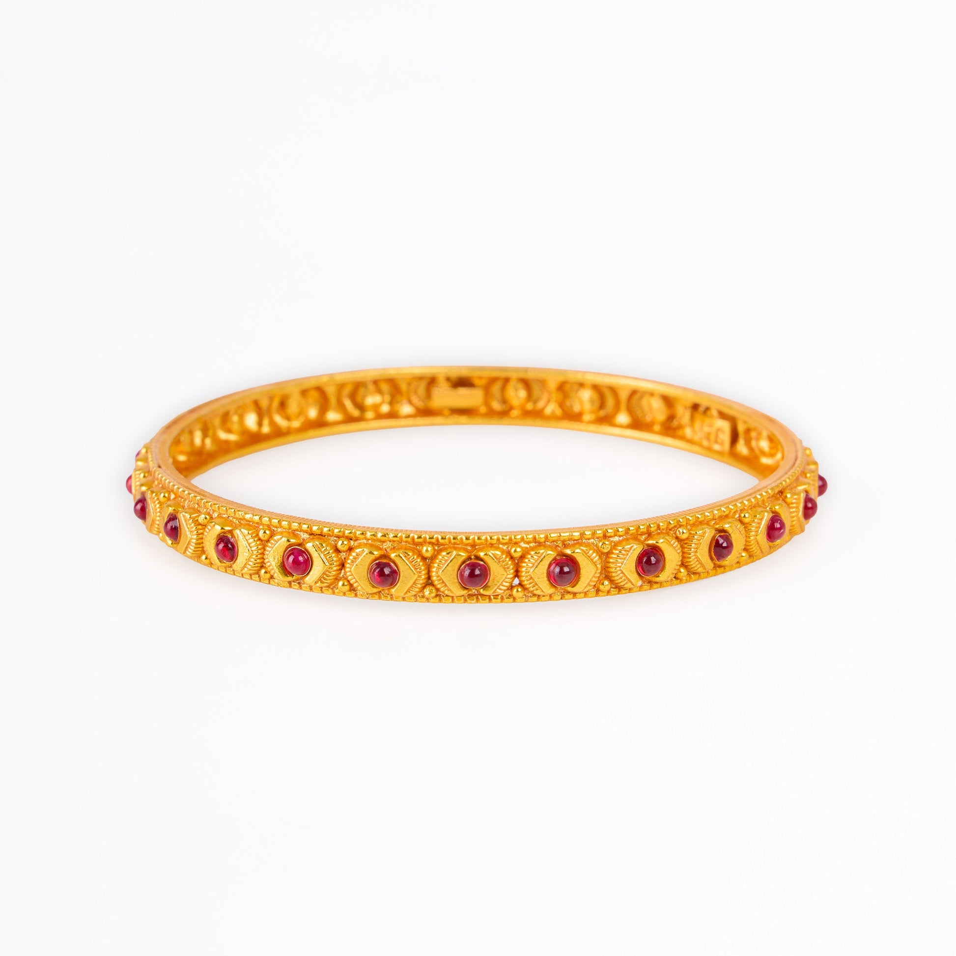 Unveil a touch of celestial elegance with these gold-finish bangles, featuring a rhythmic sequence of crescent motifs accented with vibrant ruby centers. A majestic traditional accessory, this pair showcases intricate craftsmanship, perfect for bridal wear and grand celebrations.