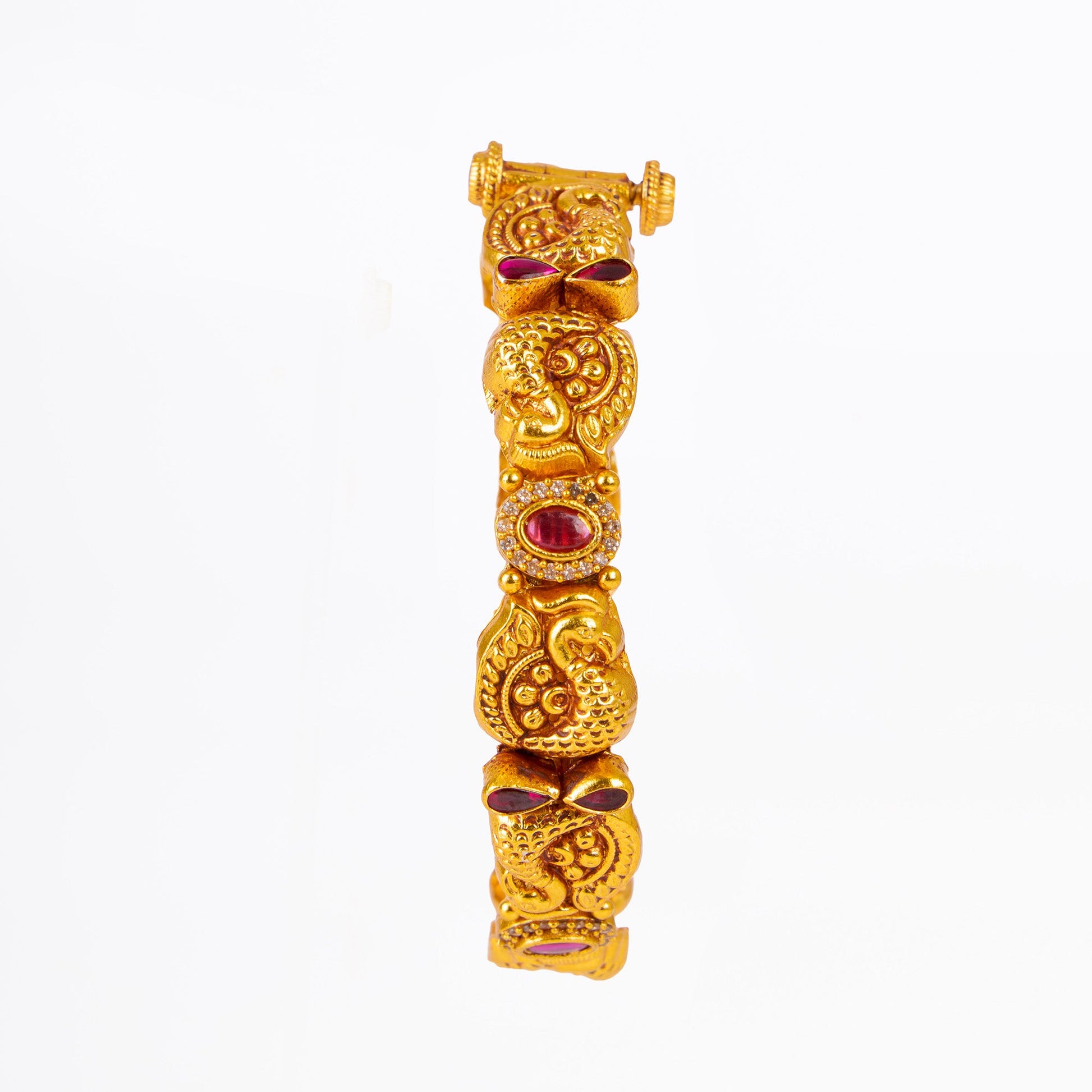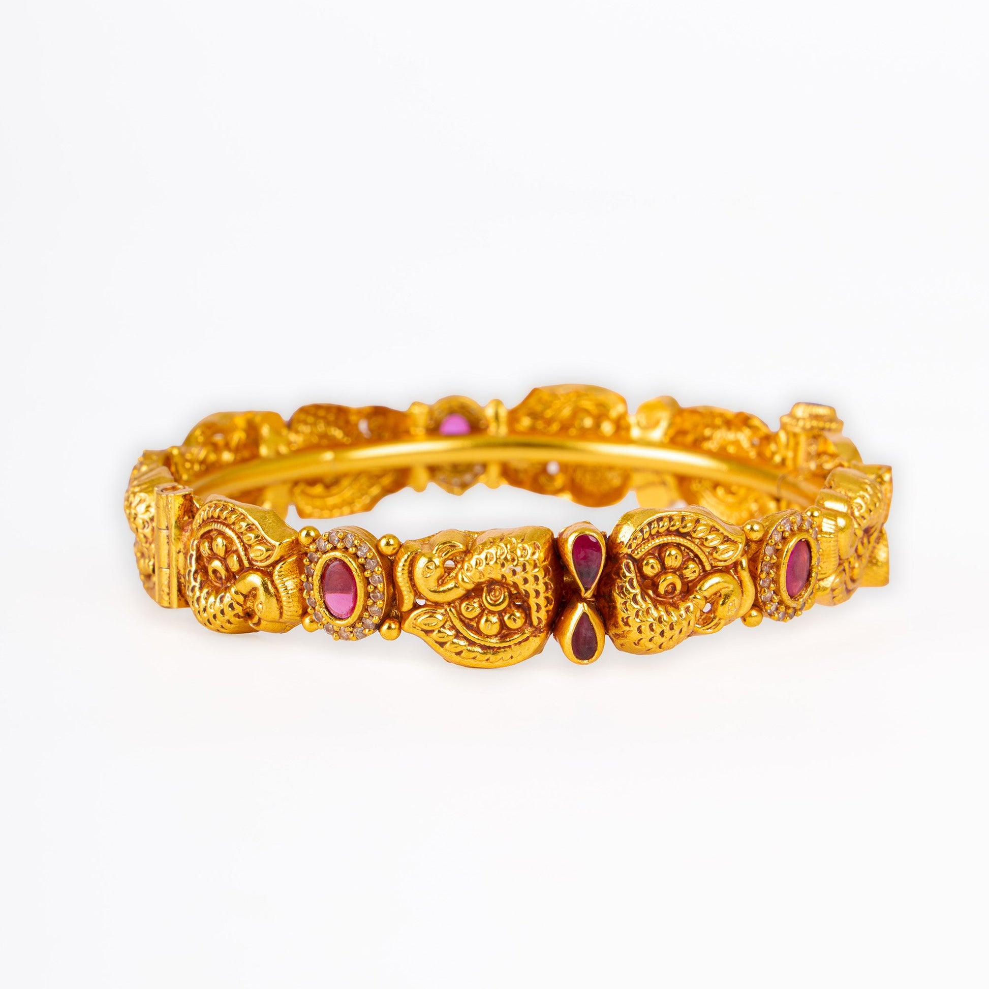 Channel timeless grace with these gold-finish bangles, featuring a rhythmic series of intricately carved peacock motifs and vibrant ruby-centered floral accents. A majestic traditional accessory, this pair showcases heritage-inspired artistry, perfect for bridal wear and grand celebrations.